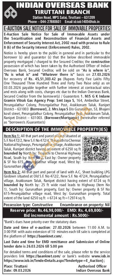 Item No 1: All that part and parcel of land situated at S.F. No472/2, New S. F. No 472/4, Thirupathito Chennai National highways, Perungalathur village, Arakkonam Taluk, Ranipet district having an extent of 6250 sq ft bounded by North by: Tirupathi to Chennai Highway Road, South by: Item No 2, East by: Owner property & SF No 615, Perungalathur village road, West by: Gurunathan property. Item No 2: All that part and parcel of land with A.C, Sheet building LPG Godown situated at Old S.F. No 472/2, New S.F. No 472/4, Perungalathur village, Arakkonam Taluk, Ranipet district having extent of 6724 sq ft bounded by North by: 25 ft wide road leads to Highway (Item No 1), South by: Gurunathan property, East by: Owner property & SF No 615-Perungalathur village road, West by: Gurunathan property. Total extent of the land 6250 sq ft +6724 sq ft=12974 sq ft.
