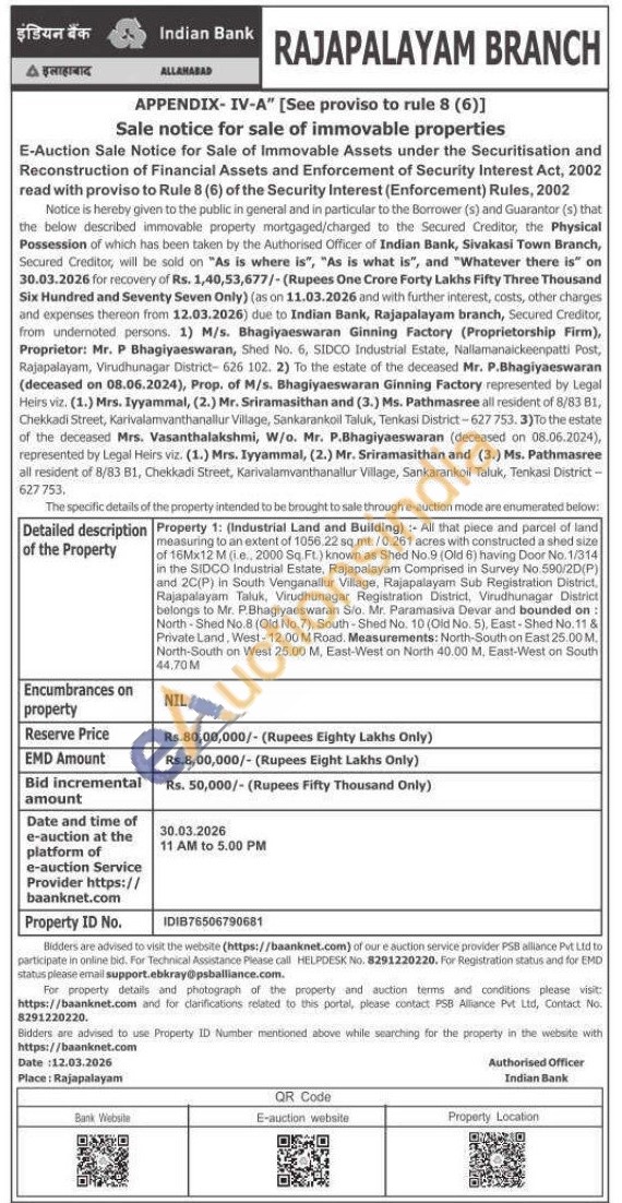 Property 1: (Industrial Land and Building):- All that piece and parcel of land measuring to an extent of 1056.22 sq.mt./0.261 acres with constructed a shed size of 16Mx12 M (ie, 2000 Sq Ft.) known as Shed No.9 (Old 6) having Door No. 1/314 in the SIDCO Industrial Estate, Rajapalayam Comprised in Survey No. 590/2D(P) and 2C(P) in South Vanganallur Village, Rajapalayam Sub Registration District, Rajapalayam Taluk, Virudhunagar Registration District, Virudhunagar District belongs to Mr. P. Bhagiyaeswaran Sio. Mr. Paramasiva Devar and bounded on: North-Shed No.8 (Old No.7), South-Shed No. 10 (Old No. 5), East-Shed No.11& Private Land, West-12.00 M Road. Measurements: North-South on East 25.00 M. North-South on West 25.00 M. East-West on North 40.00 M, East-West on South 44.70 M