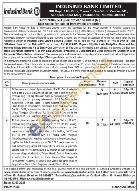 All the piece and parcel of property being Flat No C-414, admea-suring about 25.34 Sq Mtrs, on the 4th Floor, along with sit-out admeasuring 2.84 Sq Mirs and balcony admeasuring 1.78 Sq. Mitrs and open car parking admeasuring 9.29 Sq. Mirs in the building No "C"in the Phase-I, in the scheme known as "Aapla Ghar Talegaon Dhamdhere" constructed on land bearing new Gat No. 3439, admeasuring about 01 Hectors 11, situated at Village Talegaon Dhamdhere, Tal. Shirur, Dist. Pune, within the jurisdiction of Sub Regsitrar, Talegaon Dhamdhere & Shirur