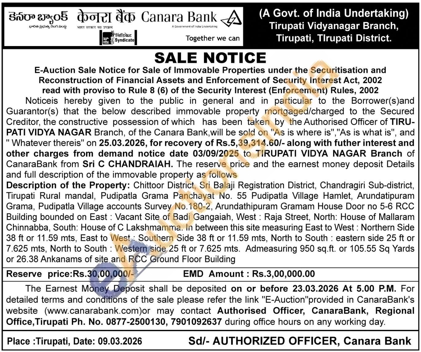 Chittoor District, Sri Balaji Registration District, Chandragiri Sub-district, Tirupati Rural mandal, Pudipatla Grama Panchayat No. 55 Pudipatla Village Hamlet, Arundatipuram Grama, Pudipatla Village accounts Survey No. 180-2, Arundathipuram Gramam House Door no 5-6 RCC Building bounded on East: Vacant Site of Badi Gangaiah, West: Raja Street, North: House of Mallaram Chinnabba, South: House of C Lakshmamma. In between this site measuring East to West: Northern Side 38 ft or 11.59 mts, East to West: Southern Side 38 ft or 11.59 mts, North to South eastern side 25 ft or 7.625 mts, North to South: Western side 25 ft or 7.625 mts. Admeasuring 950 sq.ft. or 105.55 Sq Yards or 26.38 Ankanams of site and RCC Ground Floor Building