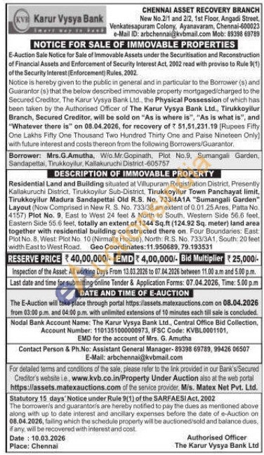 Residential Land and Building situated at Villupuram Registration District, Presently Kallakuruchi District, Tirukkoyilur Sub-District, Tirukkoyilur Town Panchayat limit, Tirukkoyilur Madura Sandapettai Old R.S. No. 733/4A1A "Sumangali Garden" Layout (Now Comprised in New R. S. No. 733/38 an extent of 0.01,25 Ares, Patta No. 4157) Plot No. 9, East to West 24 feet & North to South, Western Side 56.6 feet, Eastern Side 55.6 feet, totally an extent of 1344 Sq.ft (124.92 Sq. meter) land area together with residential building constructed there on Four Boundaries: East Plot No. 8, West: Plot No. 10 (Nirmal's House), North R.S. No. 733/3A1, South: 20 feet width East to West Road. Geo Coordinates:11.950689, 79.193531