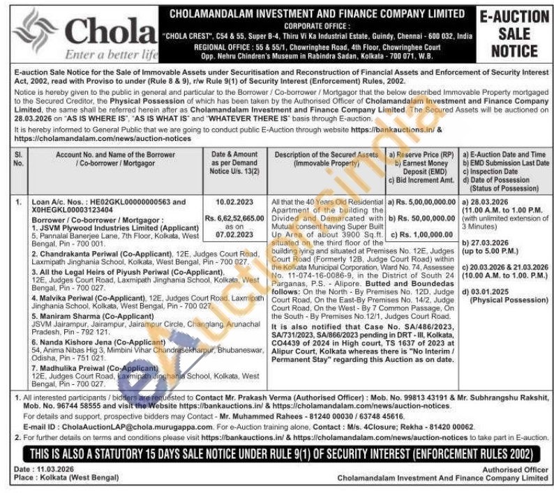 All that the 40 Years Old Residential Apartment of the building the Divided and Demarcated with Mutual consent having Super Built Up Area of about 3900 Sq.ft. situated on the third floor of the building lying and situated at Premises No. 12E, Judges Court Road (Formerly 12B, Judge Court Road) within the Kolkata Municipal Corporation, Ward No. 74, Assestre No. 11-074-16-0086-9, in the District of South 24 Parganas, P.S. Alipore. Butted and Boundedas follows: On the North By Premises No. 120. Judge Court Road. On the East-By Premises No. 14/2, Judge Court Road, On the West-By 7 Common Passage, On the South By Premises No. 12/1, Judges Court Road