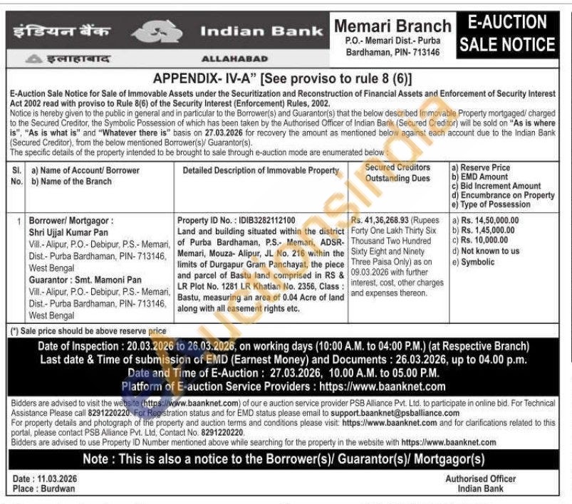 Land and building situated within the district of Purba Bardhaman, P.S.- Memari, ADSR-Memari, Mouza- Alipur, JL No. 216 within the limits of Durgapur Gram Panchayat, the piece and parcel of Bastu land comprised in RS & LR Plot No. 1281 LR Khatian No. 2356, Class: Bastu, measuring an area of 0.04 Acre of land along with all easement rights etc.