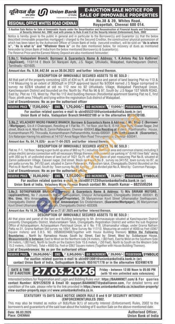All that piece and parcel of the land and Building belonging to Mr. Ammavasaiyan situated at Kancheporam District presently Chengalpattu District, Madurantakam Taluk, Chengalpattu Registration District and within the sub Registrar Office of Acharapakkam, Acharapakkam Panchayat Union, at V. No. 118, Uthamanallur village, under Grama Natham Patta no:31, Grama Natham Old survey no 109/1, New Survey No 117/13 Measuring an extent of 4000 sq Feet (0367 Square meters) and E.B.S. NO. 09586003468(Together with House Building thereon) Within the Following Boundaries: North by: Ramadoss House, South by Street, East by: Street, West by: Subbarayan House, Measurements in between: East to West on the Northern side 24 meters./(80 Feet), East to West on the Southern Side 24 meters,/(80 Feet), North to South on the Eastern Side 15.6 meters, /(50 Feet), North to South on the Western Side 15.2 meters/(50 Feet). Total-4000 Sq. Feet or 0367 Square meters (Together with House Building Thereon). List of Encumbrances: No as per the authorised officer