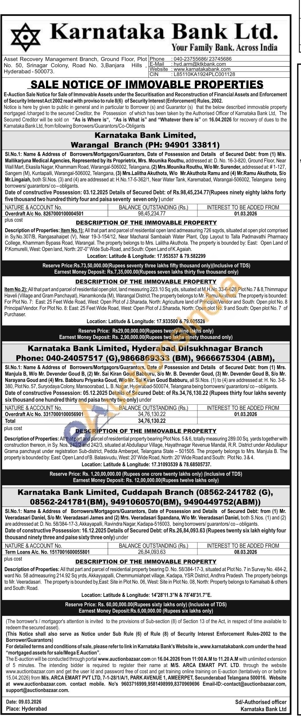 Description of Properties: All that part and parcel of residential property bearing D. No. 58/384-17-3, situated at Plot No. 7 in Survey No. 484-2, ward No. 58 admeasuring 214.92 Sq yrds, Akkayyapalli, Chemmumiahpet village, Kadapa, YSR District, Andhra Pradesh. The property belongs to Mr. Veeradasari. The property is bounded by, East: Site in Plot No. 06, West: Site in Plot No. 08, North: Property belongs to Kamalsab & others and South: Road