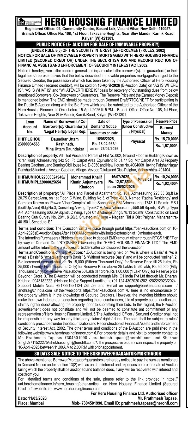 Description of property: "All Piece and Parcel of Apartment No. 101, Admeasuring 223.35 Sq.ft ie 20.75 Carpet Area, on 1st Floor, C Wing, Building No.3, of Type-C1B, Named 'Radha Residency' and Complex Known as 'Pawan Vihar Complex' all the Sanctioned FSI Admeasuring 1743.11 Sq.mtr F.S.I (built Up Area) Bldg No.3, Consisting A-wing, Type C1A, Area Admeasuring 558.59 Sq.mir, B Wing. Type A-1, Admeasuring 606.39 Sq.mtr, C Wing. Type C1B Admeasuring 578.13 Sq.mtr Constructed on Land Bearing Gut/ Survey No. 20/1, & 20/3, Situated at Village-Nagzari, Tal & Dist Palghar, Maharashtra-401501 Schedule-B