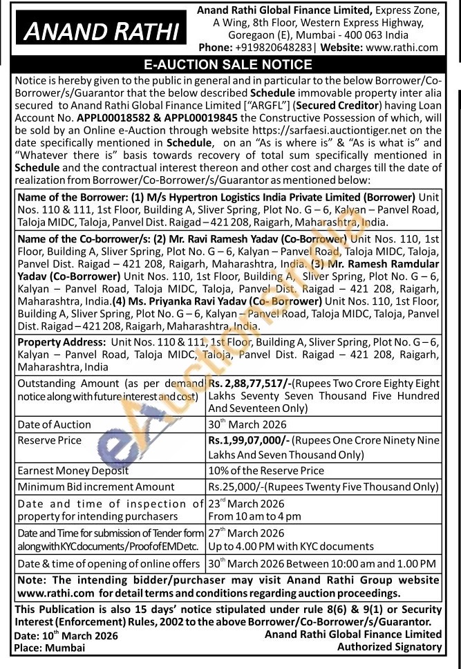 Property Address: Unit Nos. 110 & 111, 1st Floor, Building A, Sliver Spring, Plot No. G-6, Kalyan Panvel Road, Taloja MIDC, Taloja, Panvel Dist. Raigad 421 208, Raigarh, Maharashtra, India