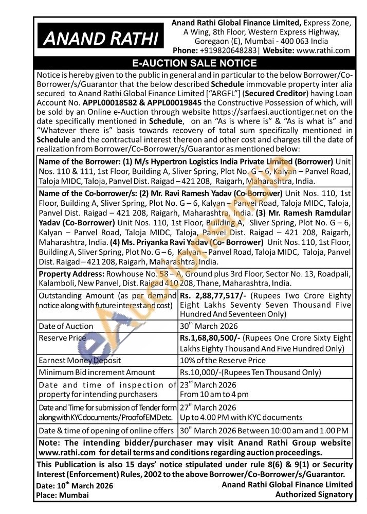 Property Address: Rowhouse No. 58-A, Ground plus 3rd Floor, Sector No. 13, Roadpali, Kalamboli, New Panvel, Dist. Raigad 410 208, Thane, Maharashtra, India