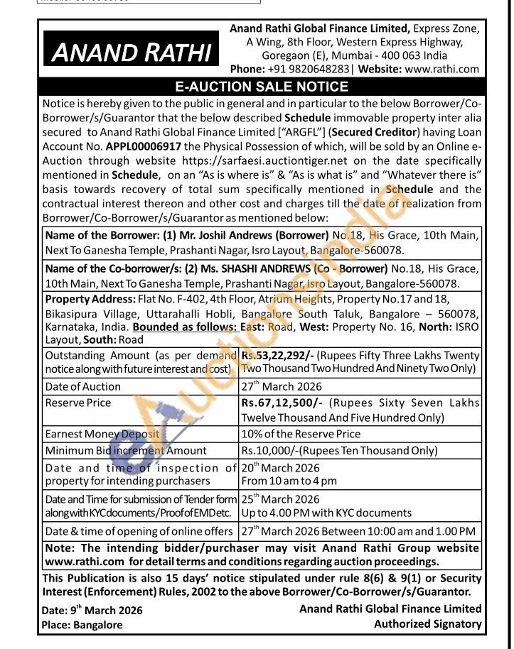 Property Address: Flat No. F-402, 4th Floor, Atrium Heights, Property No.17 and 18, Bikasipura Village, Uttarahalli Hobli, Bangalore South Taluk, Bangalore 560078, Karnataka, India. Bounded as follows: East: Road, West: Property No. 16, North: ISRO Layout, South: Road