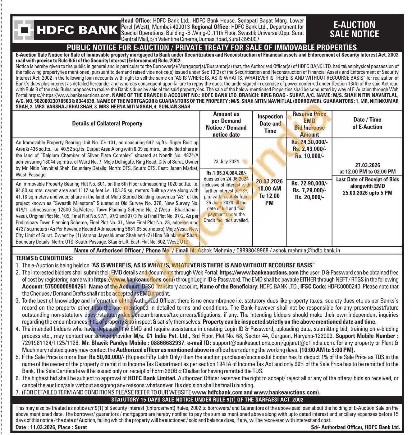 An Immovable Property Bearing Unit No. CH-101, admeasuring 642 sq.fts. Super Built up Area & 436 sq.fts., i.e. 40.52 sq.fts. Carpet Area Along with 6.09 sq.mtrs., undivided share in the land of "Belgium Chamber of Silver Plaza Complex" situated at Nondh No. 4824/A admeasuring 13044 sq.mtrs. of Ward No. 7, Moje Delhigate, Ring Road, City of Surat. Owner by Mr. Nitin Navnitlal Shah. Boundary Details: North: OTS, South: OTS, East: Japan Market, West: Passage.