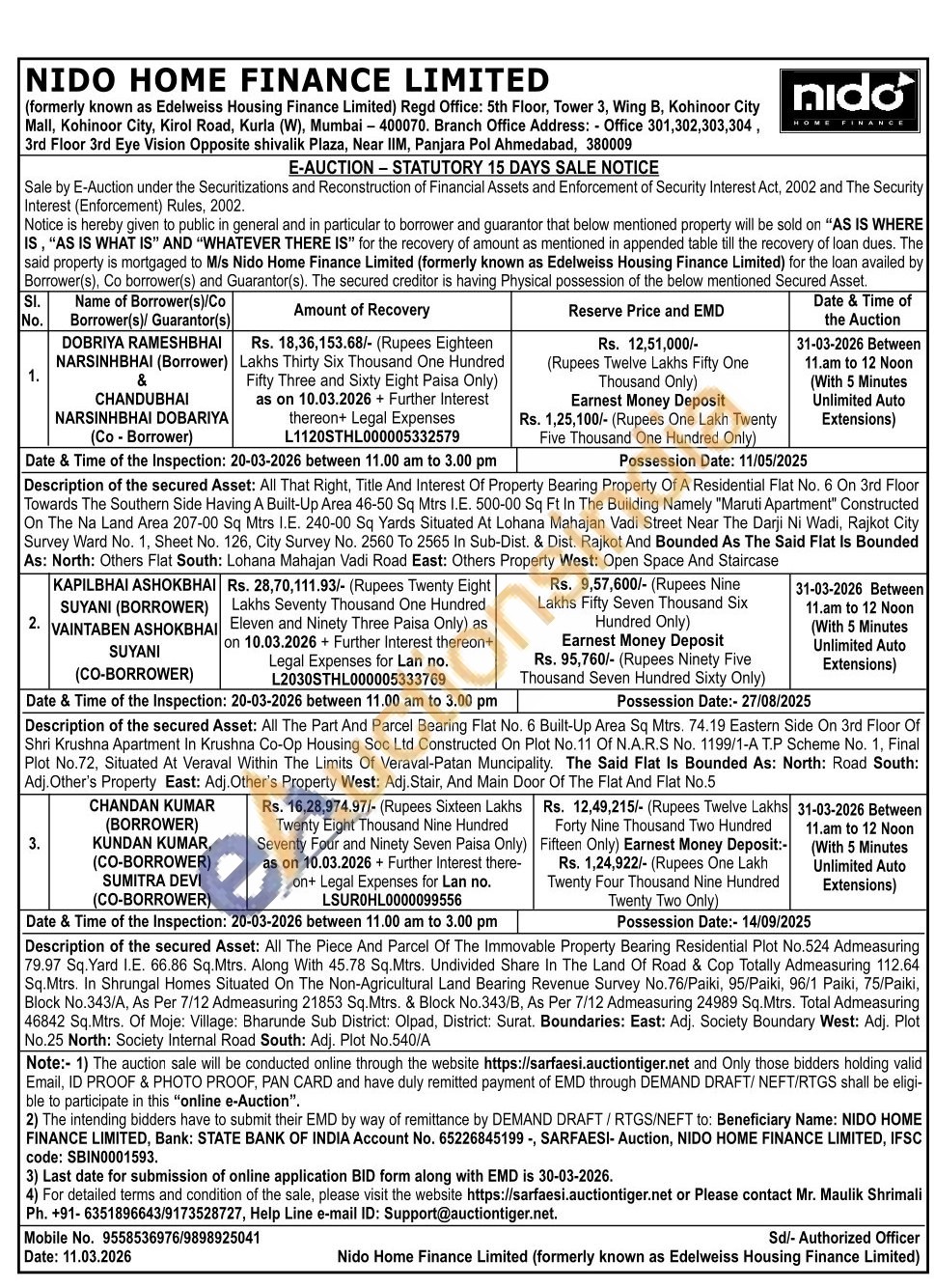 Description of the secured Asset: All That Right, Title And Interest Of Property Bearing Property Of A Residential Flat No. 6 On 3rd Floor Towards The Southern Side Having A Built-Up Area 46-50 Sq Mtrs I.E. 500-00 Sq Ft In The Building Namely "Maruti Apartment" Constructed On The Na Land Area 207-00 Sq Mtrs I.E. 240-00 Sq Yards Situated At Lohana Mahajan Vadi Street Near The Darji Ni Wadi, Rajkot City Survey Ward No. 1, Sheet No. 126, City Survey No. 2560 To 2565 In Sub-Dist. & Dist. Rajkot And Bounded As The Said Flat Is Bounded As: North: Others Flat South: Lohana Mahajan Vadi Road East: Others Property West: Open Space And Staircase