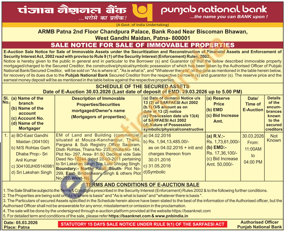 EM of Land and Building (commercial) situated at Mouza-Kanchanpur, Thana, Pargana & Sub Registry Office Sasaram, Distt- Rohtas, Thana No-235, Khata No- 164, Plot No- 297, Area- 81.50 Decimal vide Sale Deed No-12244 dated 28-09-2011 pertaining to Sri Lakshan Singh S/o, Late Shivjag Singh. Boundary:- North- Road, South- Plot No-299, East- Bindeshwary Singh & others Plot No-297, West-Nij