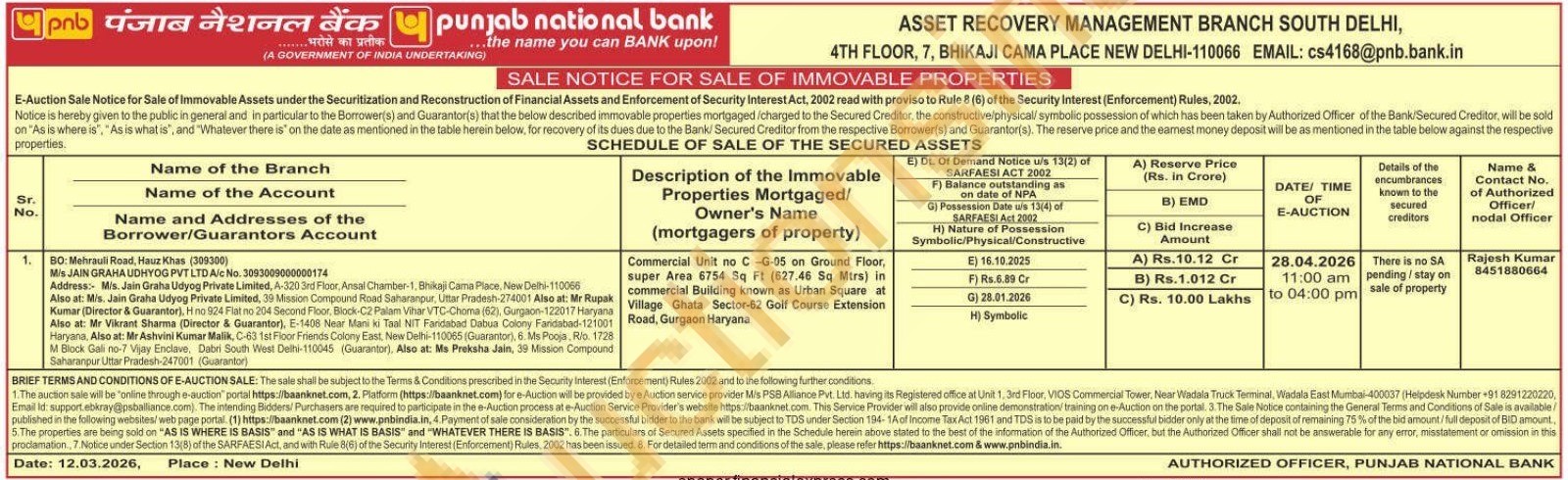 Commercial Unit no C-G-05 on Ground Floor, super Area 6754 Sq Ft (627.46 Sq Mtrs) in commercial Building known as Urban Square at Village Ghata Sector-62 Golf Course Extension Road, Gurgaon Haryana