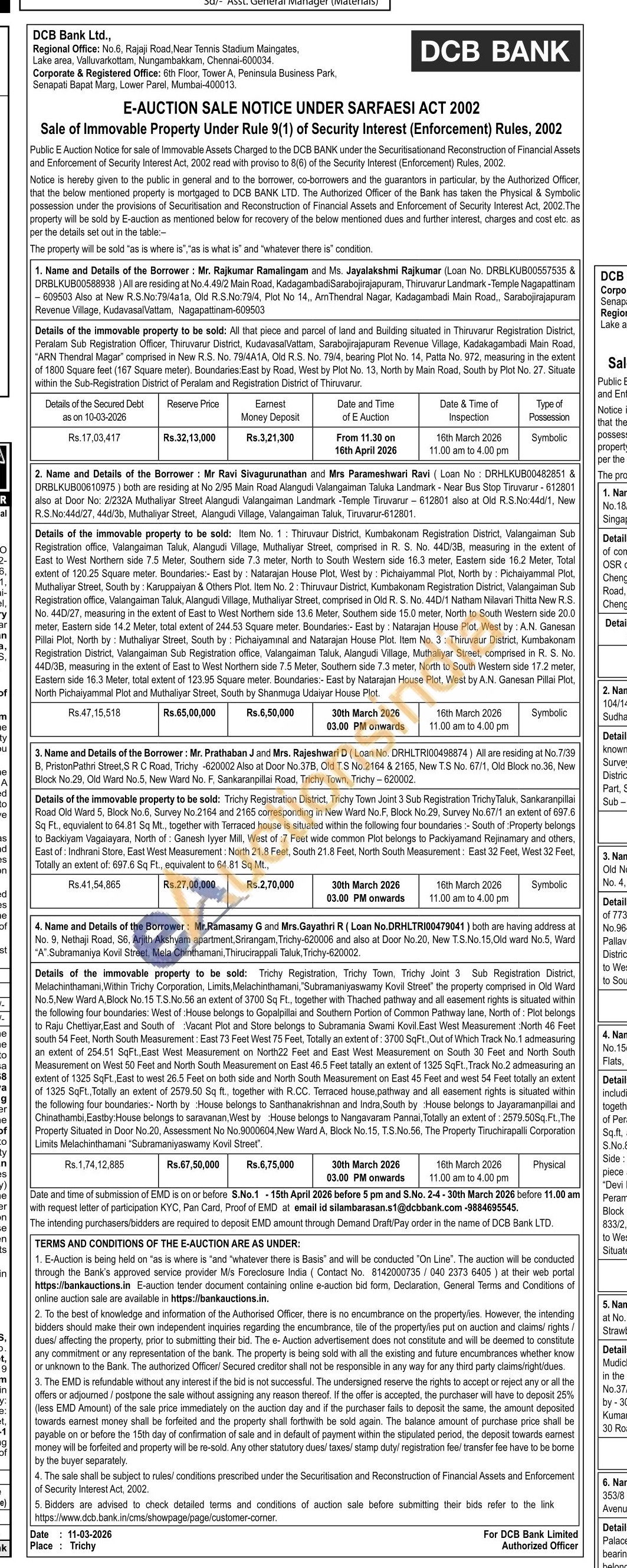 Details of the immovable property to be sold: All that piece and parcel of land and Building situated in Thiruvarur Registration District, Peralam Sub Registration Officer, Thiruvarur District, Kudavasa Valttam Sarabojirajapuram Revenue Village, Kadakagambadi Main Road, "ARN Thandral Magar' comprised in New R.S. No. 79/4A1A, Old R.S. No. 79/4, bearing Plot No. 14, Patta No. 972, measuring in the extent of 1800 Square feet (167 Square meter). Boundaries: East by Roac, West by Plot No. 13, North by Man Road, South by Plot No. 27. Situate within the Sub-Registration District of Peralam and Registration District of Thiruvarur.