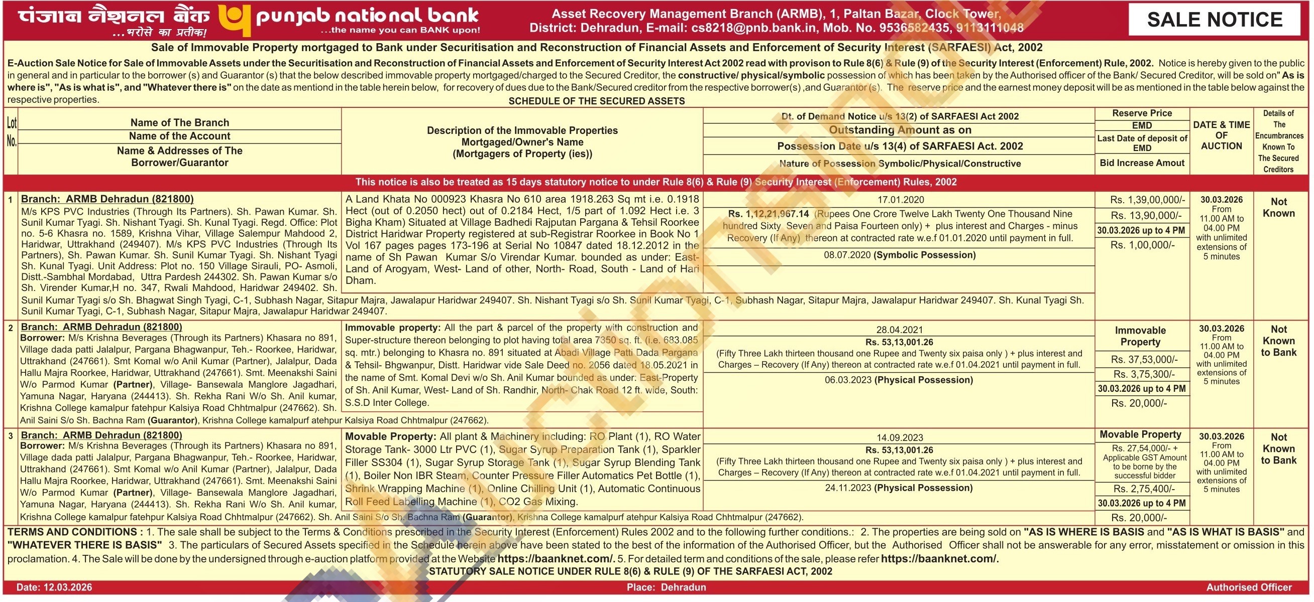 Movable Property: All plant & Machinery including: RO Plant (1), RO Water Storage Tank- 3000 Ltr PVC (1), Sugar Syrup Preparation Tank (1), Sparkler Filler SS304 (1), Sugar Syrup Storage Tank (1), Sugar Syrup Blending Tank (1), Boiler Non IBR Steam, Counter Pressure Filler Automatics Pet Bottle (1), Shrink Wrapping Machine (1), Online Chilling Unit (1), Automatic Continuous Roll Feed Labelling Machine (1), CO2 Gas Mixing
