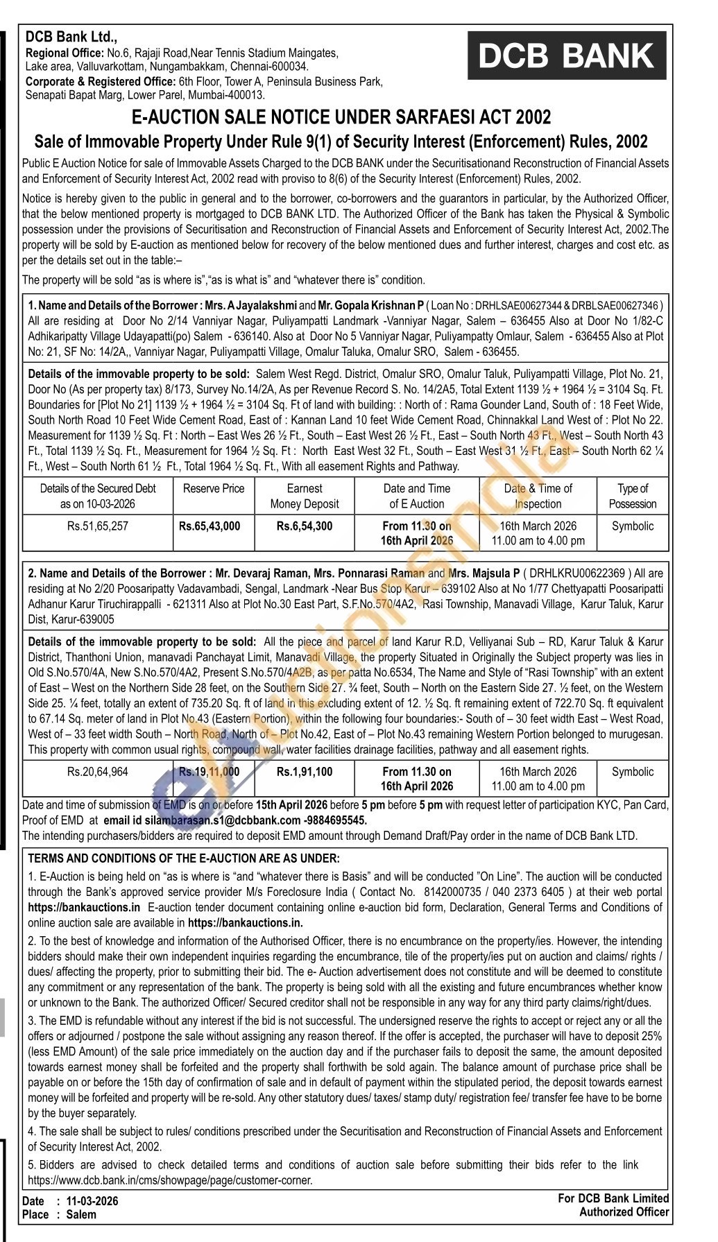 Details of the immovable property lo be sold: All the piece and parcel of land Karur R.D, Velliyanai Sub-RD, Karur Taluk & Karur District, Thanthon Union, manavadi Panchayat Limit, Manavadi Village, the property Situated in Originally the Subject property was lies in Old S.No.570/4A, New S.No.570/442, Present S.No 570/4A2B, as per patta No.6534, The Name and Style of "Ras Township" with an extent of East-West on the Northem Side 28 feet on the Southem Side 27.4 leet, South-North on the Eastern Side 27.2 feet, on the Western Side 25. % feet, totally an extent of 735.20 Sq ft of land in this excluding extent of 12 ½ Sq. ft remaining extent of 722.70 Sq ft equivalent to 57.14 Sq. meter of land in Plot No.43 (Eastern Portion), within the following four boundaries:- South of-30 feet width East-West Road, West of-33 feet width South North Road. North of Plot No.42. East of Plot No.43 remaining Westem Portion belonged to murugesan. This property with common usual rights, compound wall, water facilities drainage facilities, pathway and all easement rights.