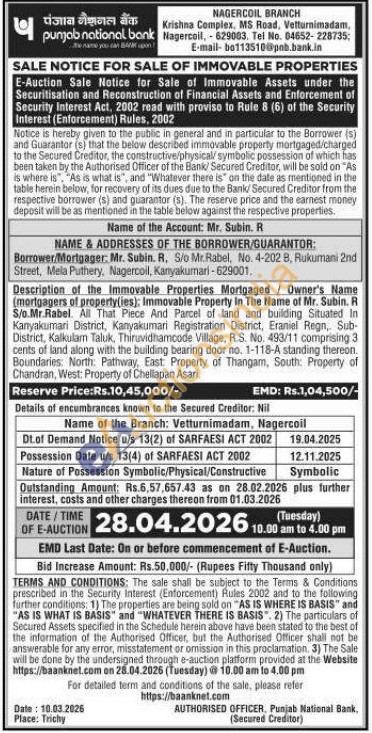 Description of the Immovable Properties Mortgaged / Owner's Name (mortgagers of property(ies): Immovable Property In The Name of Mr. Subin. R S/o Mr.Rabel. All That Piece And Parcel of land and building Situated In Kanyakumari District, Kanyakumari Registration District, Eraniel Regn, Sub-District, Kalkulam Taluk, Thiruvidhamcode Village, R.S. No. 493/11 comprising 3 cents of land along with the building bearing door no. 1-118-A standing thereon.