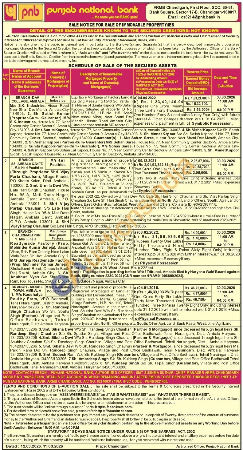 Equitable Mortgage of Factory Land & Building ding Measuring uring 1540 Sq. Yards in the Name of Sunita Kapoor W/o Satish Kapoor, Situated at Property ID No. 181C137U153, H.B No. 115. Abadi New Ashok Vihar, Near Shani Dev Mandir Hissar Road Ambala City. (Unauthorized status in MC records).