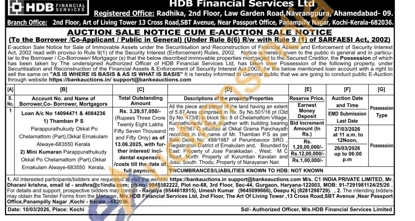 All the piece and parcel of the land having an extent of 5.87 Ares comprised in Re. Sy No.501/16 pt (Old) Sy No. 473/8) in block No: 8 of Chelamattom Village, Kunnathunadu Taluk together with building bearing no: 11/567-C situated at Okkal Grama Panchayath recorded in the name of Mr. Thamban P.S as per Sale Deed No: 499/1987 of Perumbavoor SRO Registration District of Ernakulam and, Bounded by East: Property of Jose Parakkadan, West: MC Road, North: Property of Kurumban Kavalan and Jose, South: Thodu, Property of Narayanan Nair.