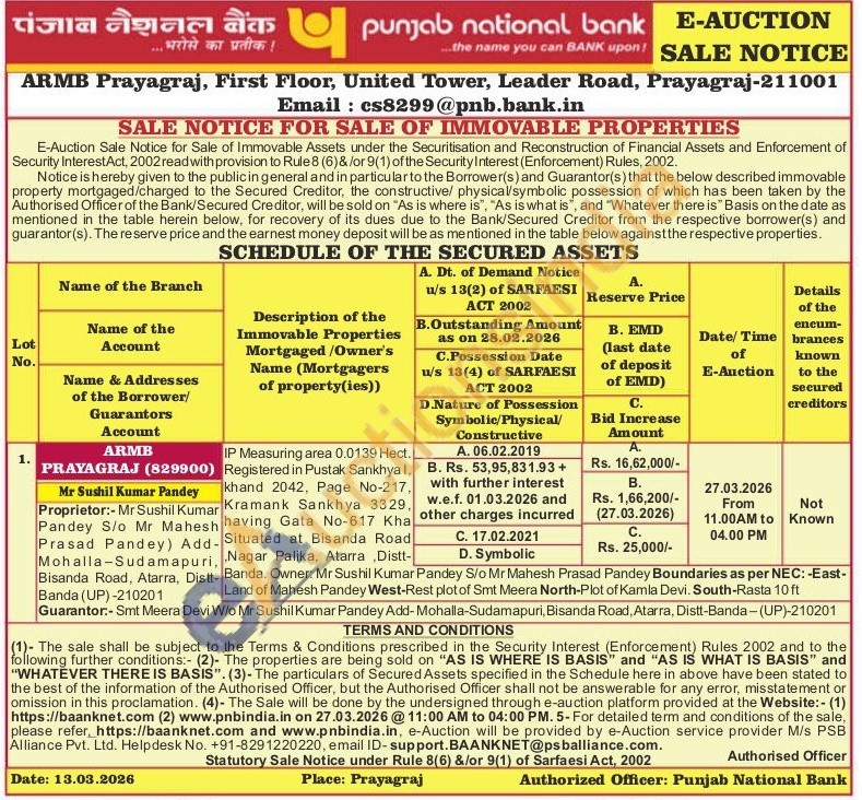 IP Measuring area 0.0139 Hect. Registered in Pustak Sankhyal, khand 2042, Page No-217, Kramank Sankhya 3329, having Gata No-617 Kha Situated at Bisanda Road Nagar Palika, Atarra, Distt-Banda. Owner: Mr Sushil Kumar Pandey S/o Mr Mahesh Prasad Pandey Boundaries as per NEC: -East-Land of Mahesh Pandey West-Rest plot of Smt Meera North-Plot of Kamla Devi. South-Rasta 10 ft