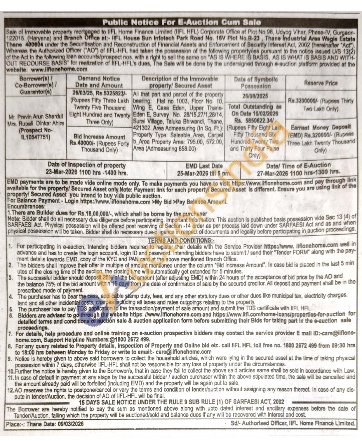 All that part and parcel of the property bearing: Flat no 1003, Floor No. 10. Wing E, Casa Eden, Upper Thane-Eden E, Survey No. 28/15,27/1,28/14, Surai Village, Taluka Bhiwandi, Thane, 421302. Area Admeasuring (In Sq. Ft.): Property Type: Saleable Area, Carpet b Area Property Area: 795.00, 572.00, Area (Admeasuring 858.00)
