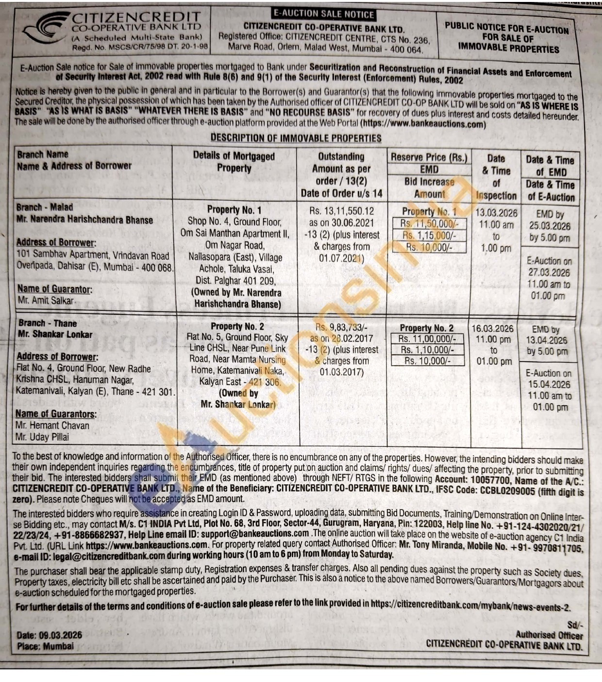 Authorised Officer: Mr. Tony Miranda, Mobile No. +91-9970811705,