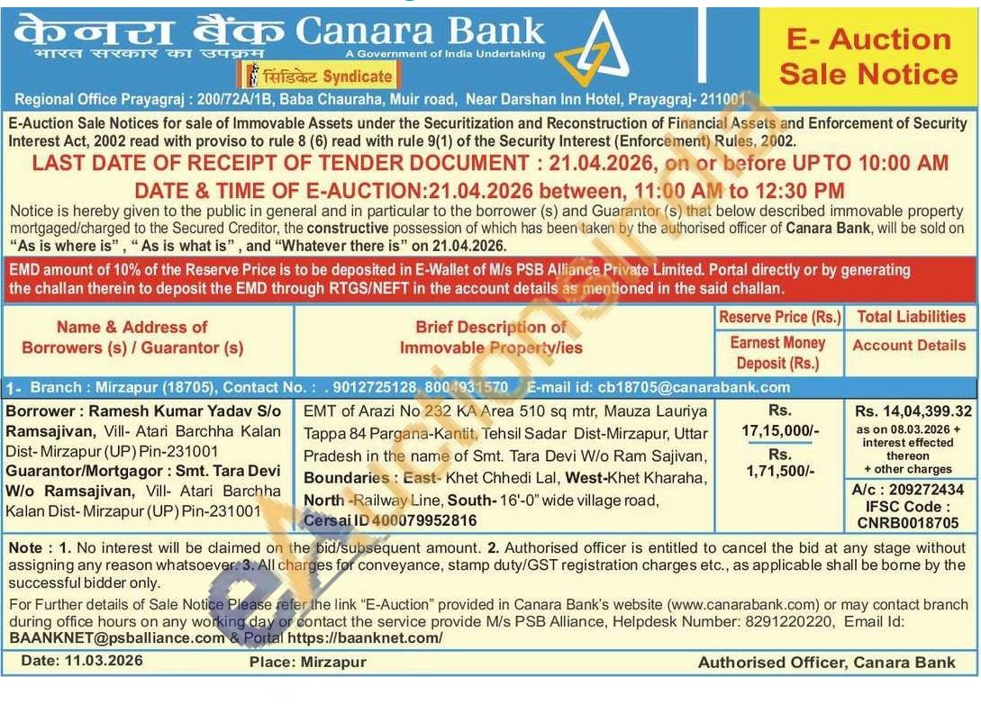 EMT of Arazi No 232 KA Area 510 sq mtr, Mauza Lauriya Tappa 84 Pargana-Kantit, Tehsil Sadar Dist-Mirzapur, Uttar Pradesh in the name of Smt. Tara Devi W/o Ram Sajivan, Boundaries: East-Khet Chhedi Lal, West-Khet Kharaha, North-Railway Line, South-16'-0" wide village road,