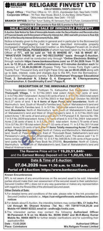 DESCRIPTION OF THE IMMOVABLE PROPERTY : Trichy Registration District, Thottiyam Tk. Kattuputhur Sub Registration District, Tholurpatti Village, 1. In S.F.No.349/3 total extent Acres 1.92 cents of land, 2. In S.F.No.350/1 total extent Acres 0.83 cents of land: 3. In S.F.No. 350/2 total extent Acres 0.40 cents of land. 4. In S.F.No. 350/3 in that New Sub Division No.350/38 Ac.0.27 cents of land; 1 to 4 items of Ayan Punja land boundaries: North of Marimuthu's land, South of Munsif's Families land, East of Mahalakshmi's land and West of: Munsif's Families land, 5. In S.F.No. 349/6 total extent Acres 1.29 cents of land, Boundaries: North of. Manmuthu's land, South of: Mahalakshmi's land, East of. Mahalakshmi's land and West of Dharmalingam's land, 6. In S.F.No.350/5 total extent Acres 1.56 cents of land and a well and 5 H.P.Pumpset EB. Service No. 159, 7.In S.F.No. 350/6 total extent Acres 1.37 cents of land, 8. in S.F.No.348/4 total extent Acres 2.38 cents of land, 9. in S.F.No.348/3 total extent Acres 0.79 cents of land, 10.In S.F.No.351/18 total extent Acres 1.02 cents of land: 11. In S.F.No.351/1A total extent Acres 0.25 cents of land, 6 to 11 items Totally measuring Acres 7.37 cents of Ayan Punja land boundaries: North of Colony and Marimuthu's, Mahalakshmi's land, South of: Palaniandi's land, East of: Tholurpatti Road, Nallathambis land and Periasamy's Land, West of Dharmalingam. Munsil's Land, The above said 1 to 11 items comes under patta No.3193: 12. In S.F.No.348/28 Ac.0.85 cents of Ayan punja land (patta No.2285 Patta Pass Book No. 375316), Boundaries: North of Colony, Marimuthu's land, South of Mahalakshmi's land, East of. Mahalakshmi's land and West of: Krishnan's land