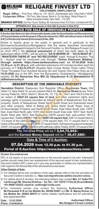 Authorized Officer Mr.Paramesh K. Non his Mobile No : 8939605467 / Mr.R.Manoj Kumar Mobile No : 9940446070