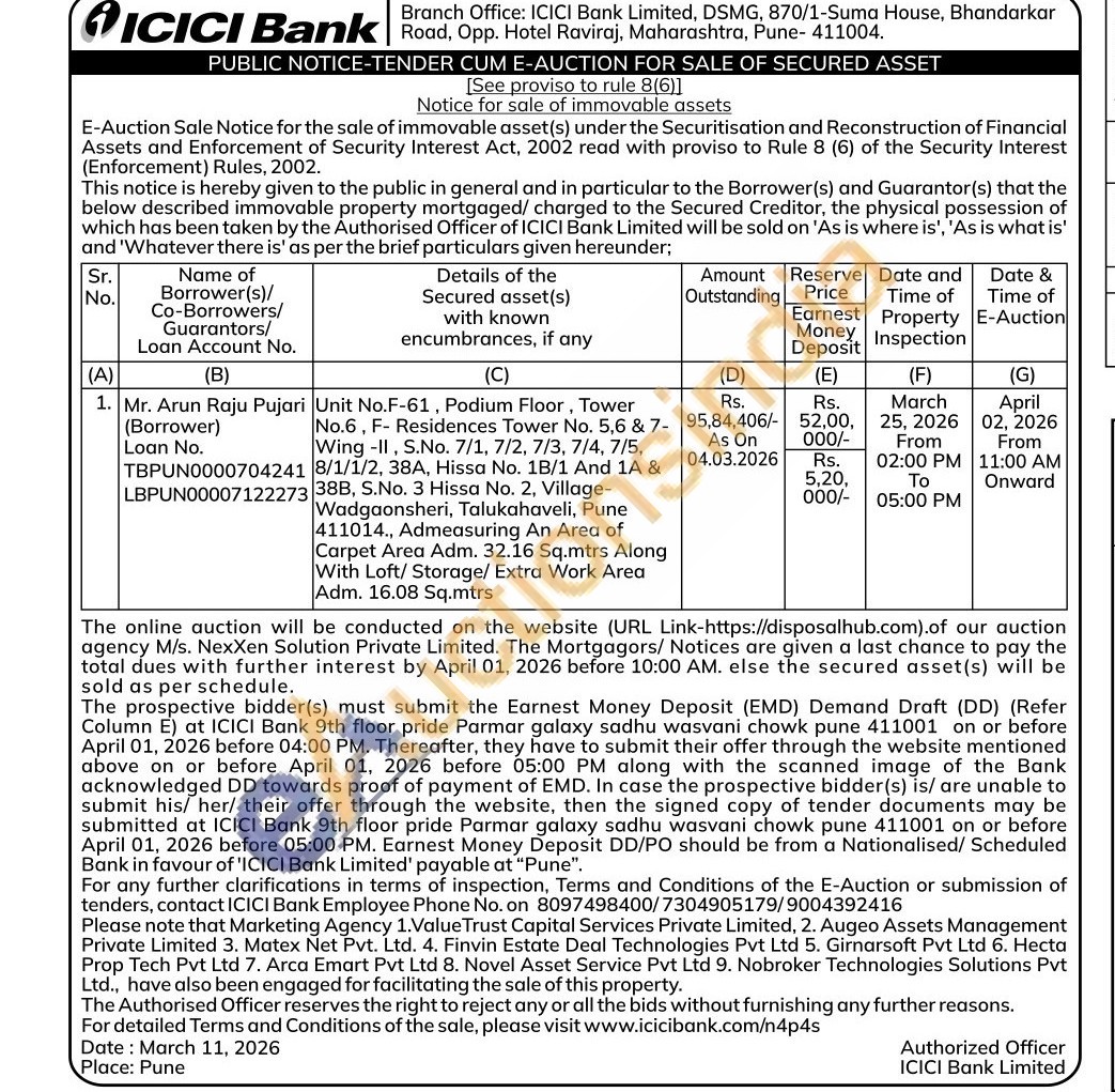 Unit No.F-61, Podium Floor, Tower No.6, F- Residences Tower No. 5,6 & 7-Wing-II, S.No. 7/1, 7/2, 7/3, 7/4, 7/5, 8/1/1/2, 38A, Hissa No. 1B/1 And 1A & 38B, S.No. 3 Hissa No. 2, Village-Wadgaonsheri, Taluka haveli, Pune 411014., Admeasuring An Area of Carpet Area Adm. 32.16 Sq.mtrs Along With Loft/Storage/ Extra Work Area Adm. 16.08 Sq.mtrs