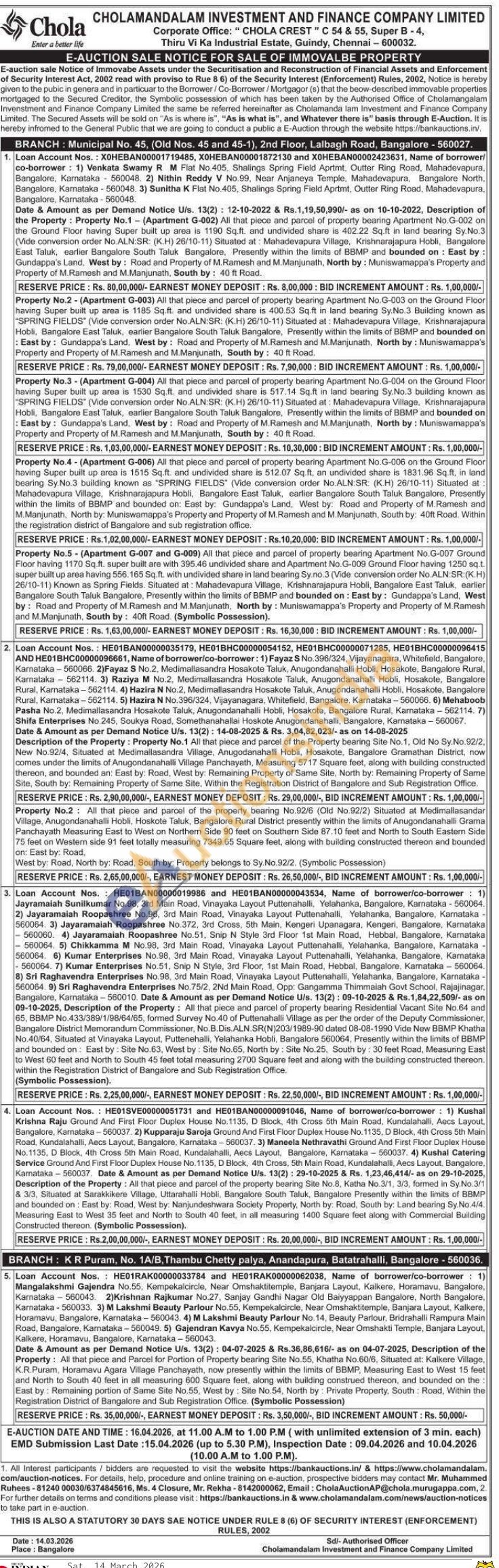 5) All that piece and Parcel for Portion of Property bearing Site No.55, Khatha No.60/6, Situated at: Kalkere Village, K.R.Puram, Horamavu Agara Village Panchayath, now presently within the limits of BBMP, Measuring East to West 15 feet and North to South 40 feet in all measuring 600 Square feet, along with building construed thereon, and bounded on the East by: Remaining portion of Same Site No.55, West by: Site No.54, North by: Private Property, South Road, Within the Registration District of Bangalore and Sub Registration Office. (Symbolic Possession)