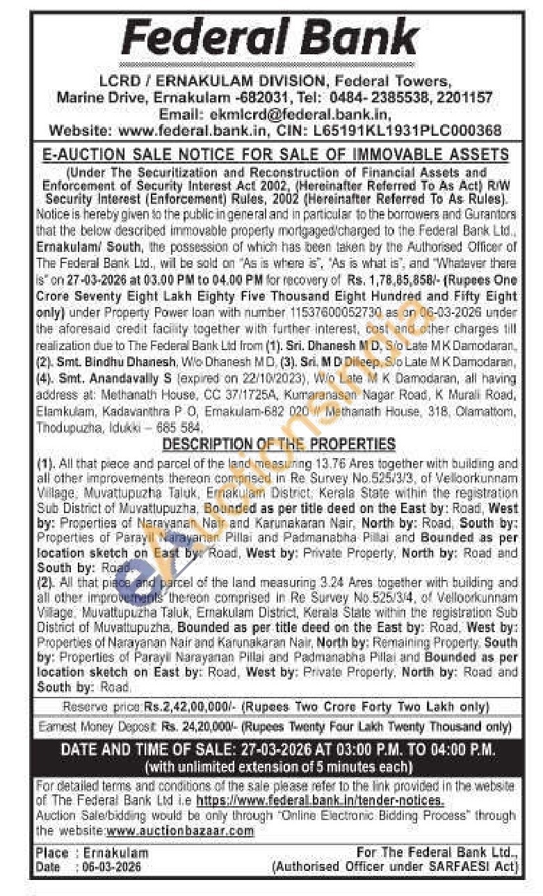 ). All that prece and parcel of the land measuring 13.76 Ares together with building and all other improvements thereon comprised in Re Survey No.525/3/3, of Velloorkunnam Village, Muvattupuzha Taluk, Emakulam District, Kerala State within the registration Sub District of Muvattupuzha, Bounded as per title deed on the East by: Road, West by: Properties of Narayanan Nair and Karunakaran Nair, North by: Road, South by: Properties of Parayil Narayanan Pillai and Padmanabha Pillai and Bounded as per location sketch on East by: Road, West by: Private Properly, North by: Road and South by: Road. (2). All that piece and parcel of the land measuring 3.24 Ares together with building and all other improvements thereon comprised in Re Survey No. 525/3/4, of Velloorkunnam Village. Muvattupuzha Taluk, Ernakulam District, Kerala State within the registration Sub District of Muvattupuzha, Bounded as per title deed on the East by: Road, West by: Properties of Narayanan Nair and Karunakaran Nair, North by: Remaining Property, South by: Properties of Parayil Narayanan Pillai and Padmanabha Pillai and Bounded as per location sketch on East by: Road, West by: Private Property, North by: Road and South by: Road