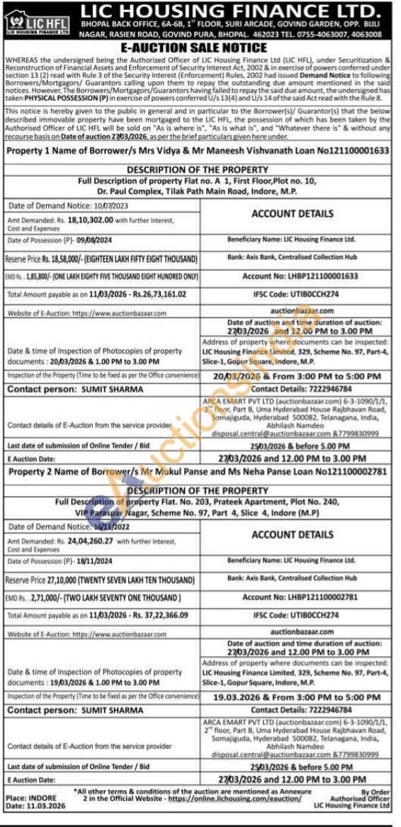 Full Description of property Flat. No. 203, Prateek Apartment, Plot No. 240, VIP Paraspar Nagar, Scheme No. 97, Part 4, Slice 4, Indore (M.P)