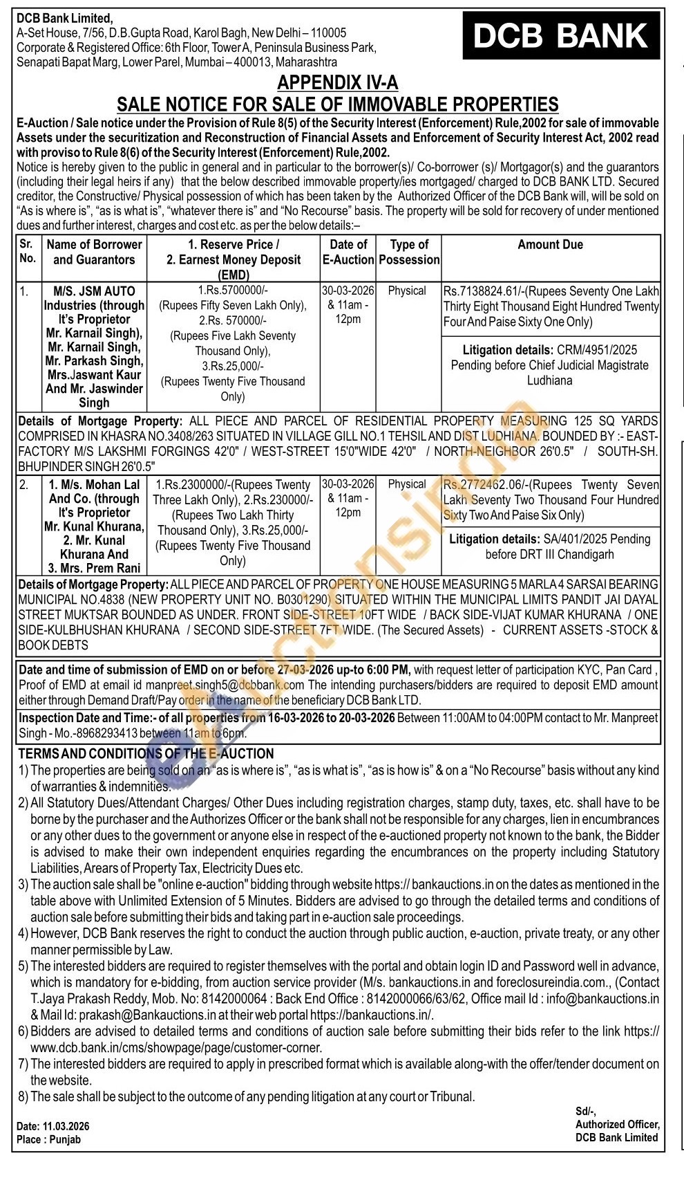 Details of Mortgage Property: ALL PIECE AND PARCEL OF PROPERTY ONE HOUSE MEASURING 5 MARLA 4 SARSAI BEARING MUNICIPAL NO.4838 (NEW PROPERTY UNIT NO. B0301290) SITUATED WITHIN THE MUNICIPAL LIMITS PANDIT JAI DAYAL STREET MUKTSAR BOUNDED AS UNDER. FRONT SIDE-STREET 10FT WIDE/BACK SIDE-VIJAT KUMAR KHURANA/ONE SIDE-KULBHUSHAN KHURANA / SECOND SIDE-STREET 7FT WIDE. (The Secured Assets) CURRENT ASSETS-STOCK & BOOK DEBTS