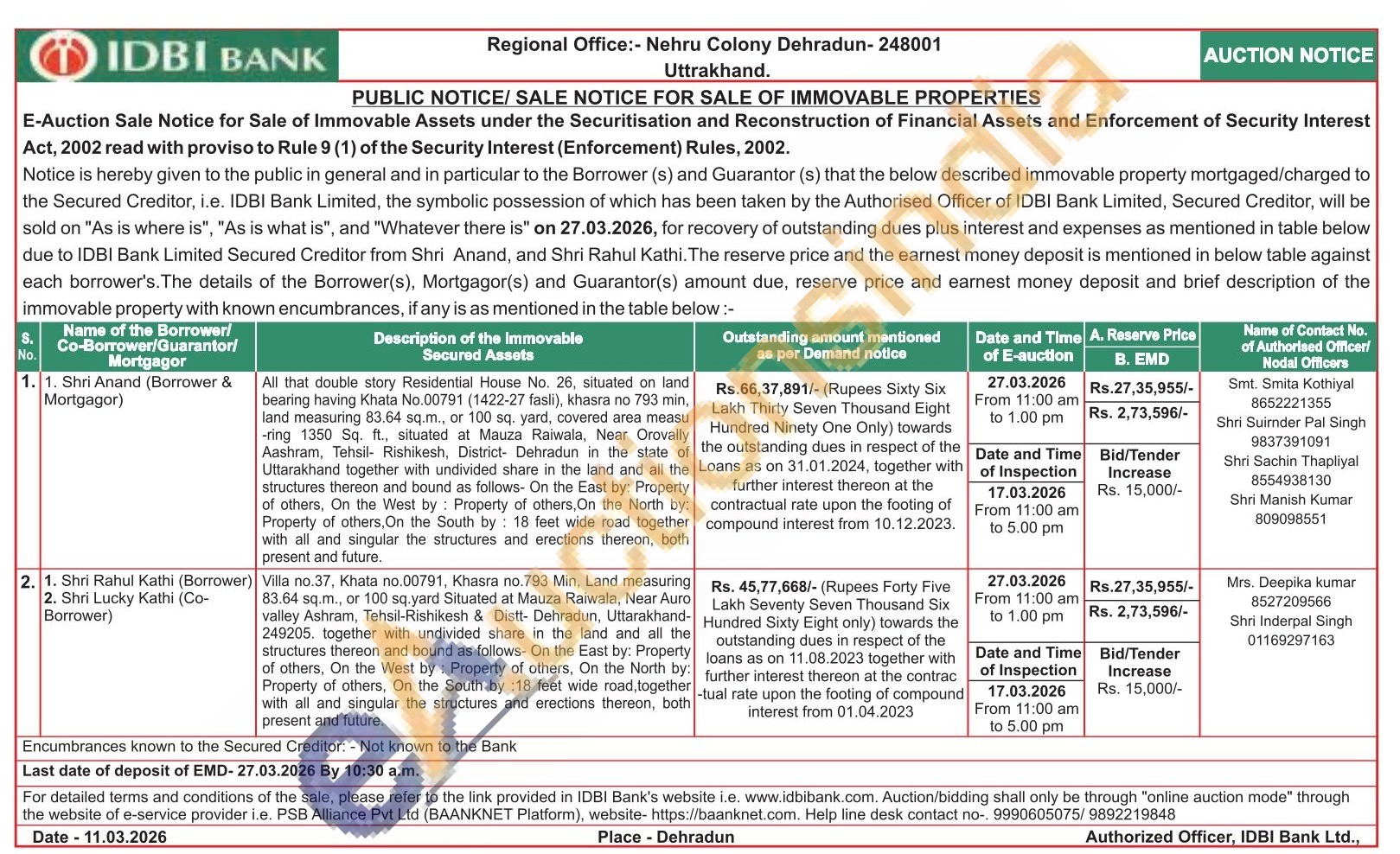 Villa no.37, Khata no.00791, Khasra no.793 Min, Land measuring 83.64 sq.m., or 100 sq.yard Situated at Mauza Raiwala, Near Auro valley Ashram, Tehsil-Rishikesh & Distt- Dehradun, Uttarakhand-249205. together with undivided share in the land and all the structures thereon and bound as follows- On the East by: Property of others. On the West by: Property of others, On the North by: Property of others, On the South by :18 feet wide road, together with all and singular the structures and erections thereon, both present and future.