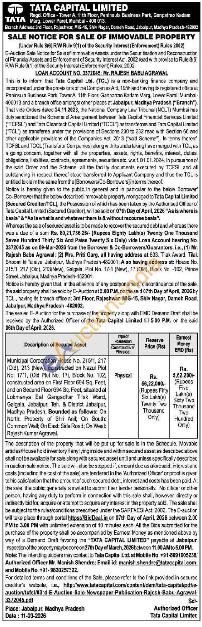 Municipal Corporation House No. 215/1, 217 (Old), 213 (New), constructed on Nazul Plot No. 17/1, (Old Plot No. 17), Block No. 102, constructed area on First Floor 694 Sq. Feet, and on Second Floor 694 Sq. Feet, situated at Lokmanya Bal Gangadhar Tilak Ward, Galgala, Jabalpur, Teh. & District Jabalpur, Madhya Pradesh. Bounded as follows: On North: Property of Shri Anil; On South: Common Wall; On East: Side Road; On West: Rajesh Kumar Agrawal.