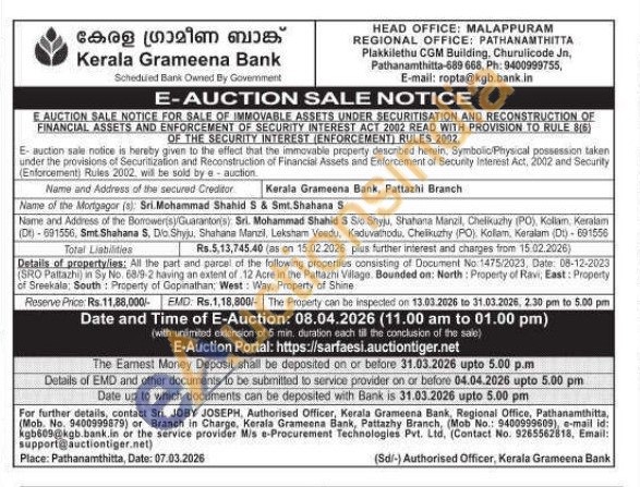 Details of property/ies: All the part and parcel of the following properties consisting of Document No: 1475/2023, Date: 08-12-2023 (SRO Paltazhi) in Sy No. 68/9-2 having an extent of 12 Acre in the Pattazhi Vilage. Bounded on: North: Property of Ravi, East: Property of Sreekals: South Property of Gopinathan, West Way, Property of Shine