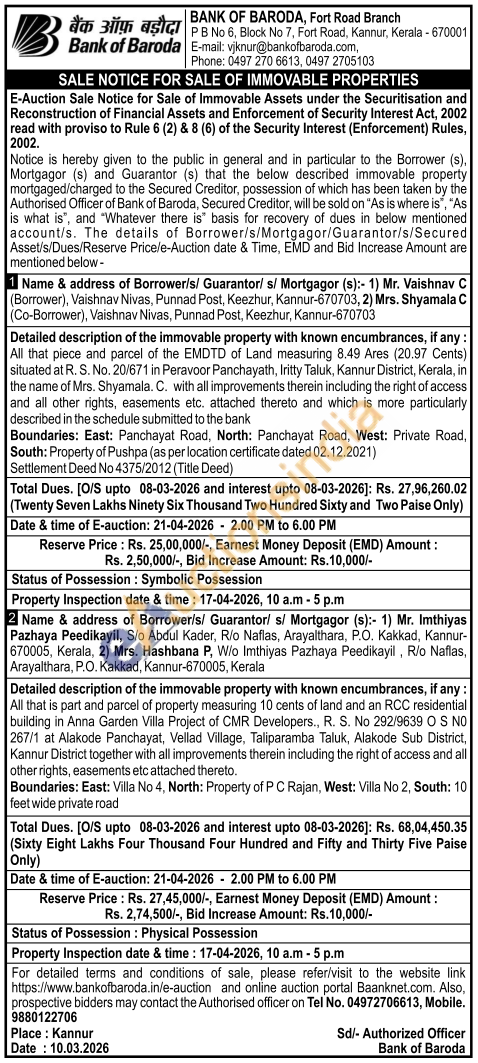 Detailed description of the immovable property with known encumbrances, if any: All that piece and parcel of the EMDTD of Land measuring 8.49 Ares (20.97 Cents) situated at R. S. No. 20/671 in Peravoor Panchayath, Iritty Taluk, Kannur District, Kerala, in the name of Mrs. Shyamala. C. with all improvements therein including the right of access and all other rights, easements etc. attached thereto and which is more particularly described in the schedule submitted to the bank