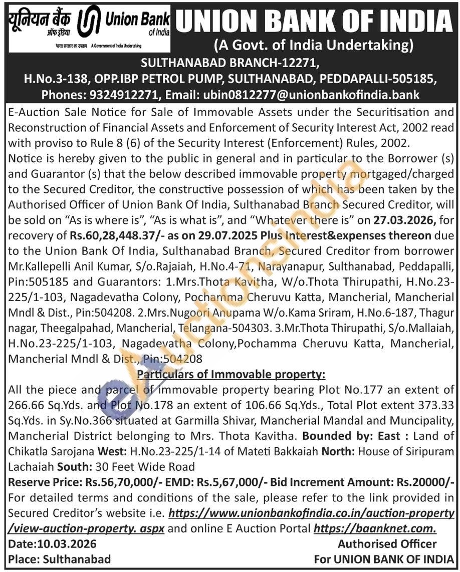 All the piece and parcel of immovable property bearing Plot No.177 an extent of 266.66 Sq.Yds. and Plot No.178 an extent of 106.66 Sq.Yds., Total Plot extent 373.33 Sq.Yds. in Sy.No.366 situated at Garmilla Shivar, Mancherial Mandal and Muncipality, Mancherial District belonging to Mrs. Thota Kavitha. Bounded by: East: Land of Chikatla Sarojana West: H.No.23-225/1-14 of Mateti Bakkaiah North: House of Siripuram Lachaiah South: 30 Feet Wide Road