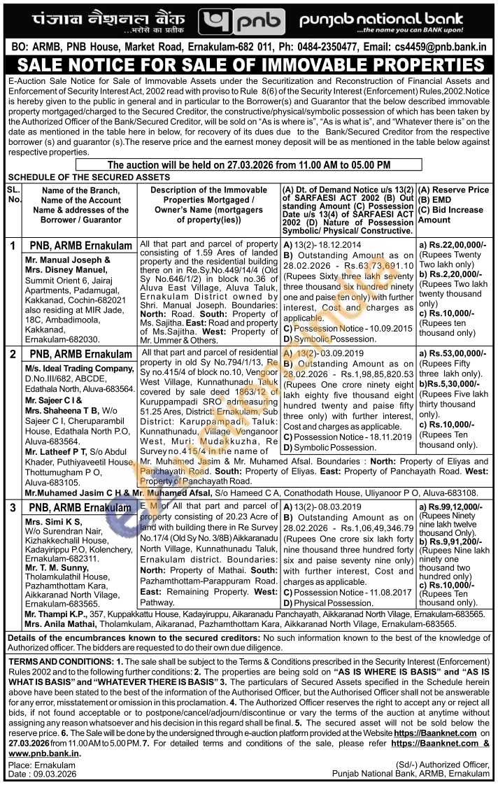 Contact number 0484-2350477, Email: cs4459@pnb.bank.in