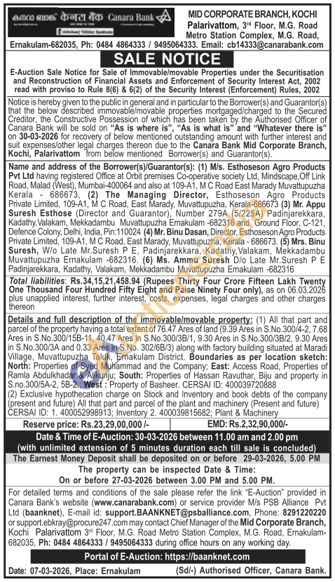Details and full description of the immovable/movable property: (1) All that part and parcel of the property having a total extent of 76.47 Ares of land (9.39 Ares in S.No.300/4-2, 7.68 Ares in S.No.300/15B-11, 40.47 Ares in S.No.300/3B/1, 9.30 Ares in S.No.300/3B/2, 9.30 Ares in S.No.300/3A and 0.33 Ares in S.No. 302/6B/3) along with factory building situated at Maradi Village, Muvattupuzha Taluk, Ernakulam District. Boundaries as per location sketch: North: Properties of Syed Muhammad and the Company; East: Access Road, Properties of Ramla Abdulkhadar & Alikunju; South: Properties of Hassan Ravuthar, Biju and property in S.no.300/5A-2, 58-2.; West: Property of Basheer. CERSAI ID: 400039720888 (2) Exclusive hypothecation charge on Stock and Inventory and book debts of the company (present and future) All that part and parcel of the plant and machinery (Present and future)