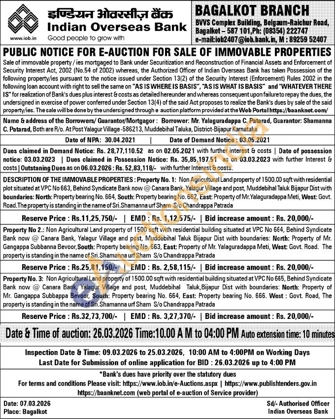 Property No 2.: Non Agricultural Land property of 1500 sqft with residential building situated at VPC No 664, Behind Syndicate Bank now @ Canara Bank, Yalagur Village and post, Muddebihal Taluk Bijapur Dist with boundaries: North: Property of Mr. Gangappa Subbanna Bevoor, South: Property bearing No. 663, East: Property of Mr. Yalaguradappa Meti, West: Govt. Road. The property is standing in the name of Sri. Shamanna urf Sham S/o Chandrappa Patrada