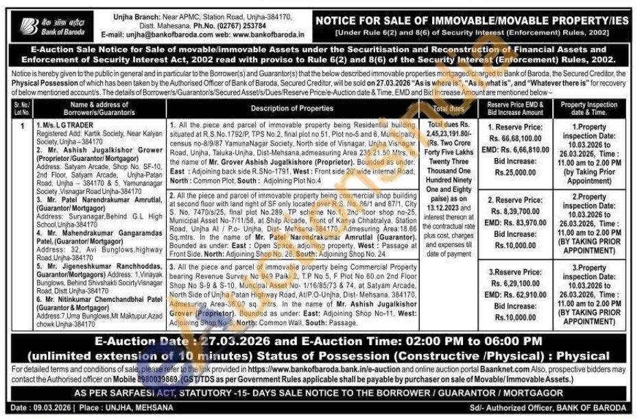 3. All the piece and parcel of immovable property being Commercial Property bearing Revenue Survey No 949 Paiki 2, T.P No 5, F Plot No 60 on 2nd Floor Shop No S-9 & S-10, Muncipal Asset No- 1/16/85/73 & 74, at Satyam Arcade. North Side of Unjha Patan Highway Road, At/P.O-Unjha, Dist-Mehsana, 384170, Admesuring Area-36.00 sq. mtrs. In the name of Mr. Ashish Jugalkishor Adjoining Shop No-8, North: Common Wall, South: Passage. Grover (Proprietor). Bounded as under: East: Adjoining Shop No-11, West: