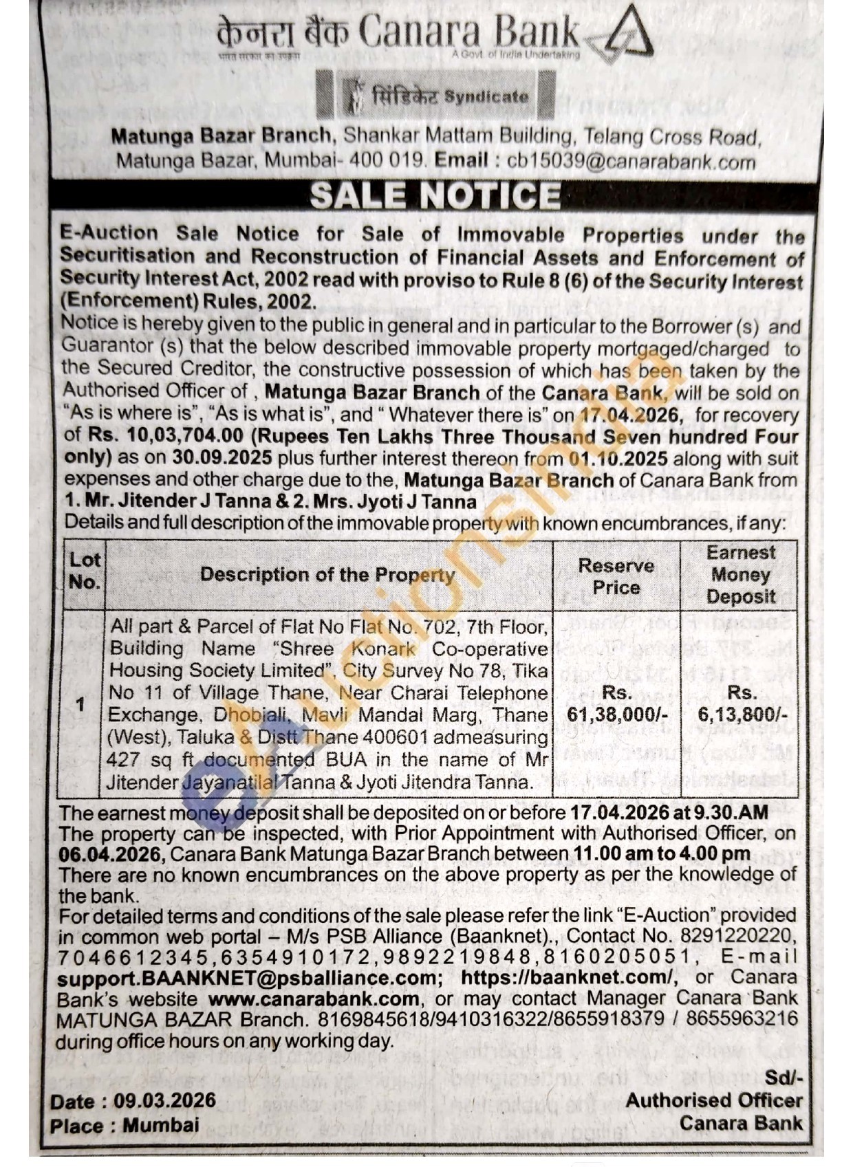 All part & Parcel of Flat No Flat No. 702, 7th Floor, Building Name "Shree Konark Co-operative Housing Society Limited", City Survey No 78, Tika No 11 of Village Thane, Near Charai Telephone Exchange, Dhobiali, Mavli Mandal Marg, Thane (West), Taluka & Distt Thane 400601 admeasuring 427 sq ft documented BUA in the name of Mr Jitender Jayanatilal Tanna & Jyoti Jitendra Tanna