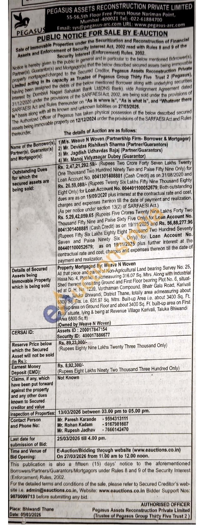 All that piece and parcel of Non-Agricultural Land bearing Survey No. 25, Hissa No. 4, Plot No. 5 acmeasuring 316.07 Sq. Mirs. Along with industrial Shed thereon consisting Ground and First Floor bearing Plot No. 6, situat-ed at G. H. No. 1239. Vardhaman Compound, Bhatr Gala Road, Karivall Village, Taluka Bhiwandi, District Thane, totally area admeasuring about 6800 Sq. Fts. Le. 631.97 Sq Mtrs. Buill-up Area is about 3400 Sq. Ft. built-up area on Ground Floor and about 3400 Sq. Ft. built-up area on First Floor situate, lying & being at Revenue Village Karivall, Taluka Bhiwandi (Area 6800 Sq.ft)
