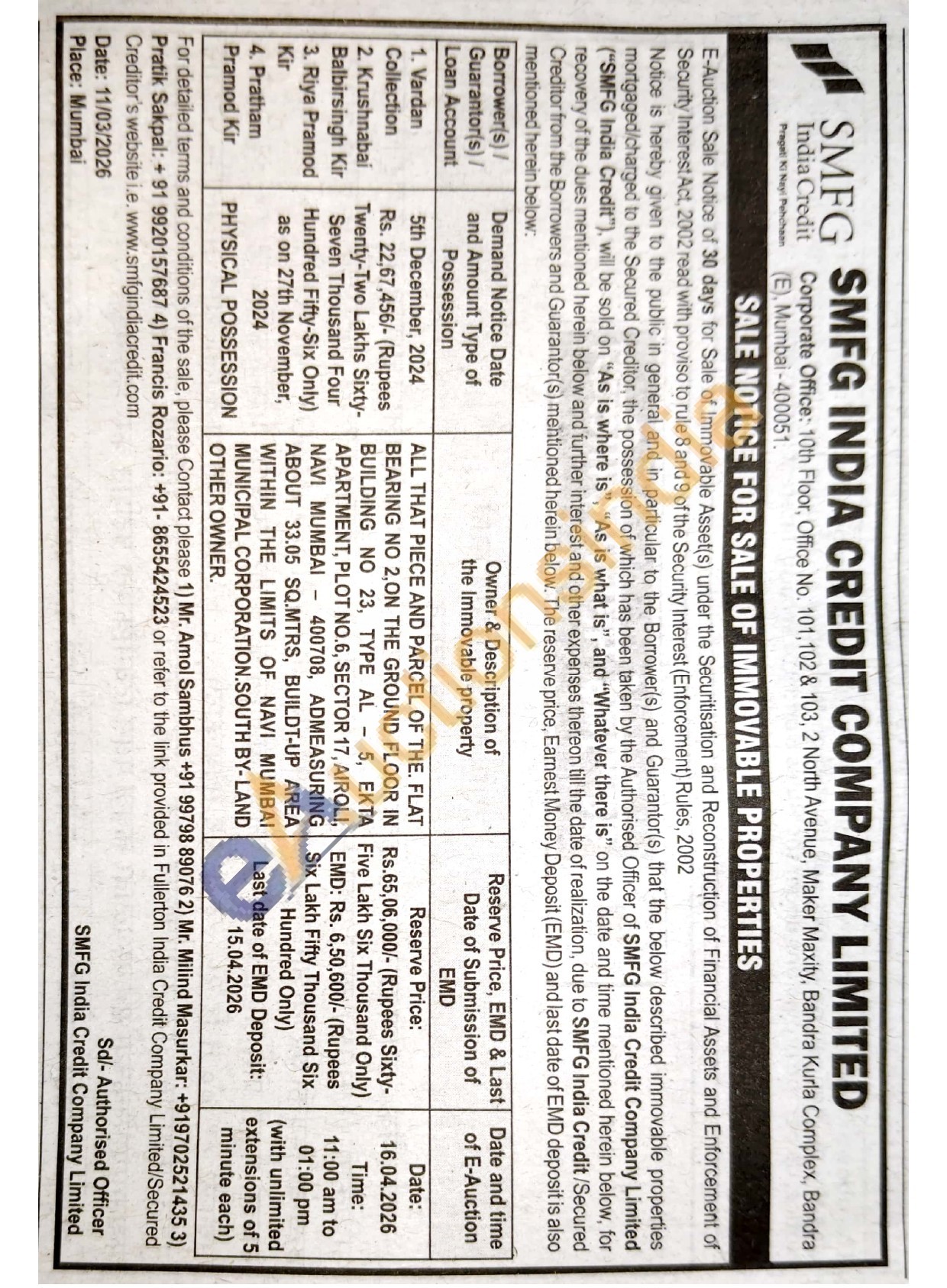 ALL THAT PIECE AND PARCEL OF THE. FLAT BEARING NO 2,ON THE GROUND FLOOR IN BUILDING NO 23, TYPE AL 5, EKTA APARTMENT, PLOT NO.6, SECTOR 17, AIROLI, NAVI MUMBAI 400708, ADMEASURING ABOUT 33.05 SQ.MTRS, BUILDT-UP AREA WITHIN THE LIMITS OF NAVI MUMBAI MUNICIPAL CORPORATION.SOUTH BY-LAND OTHER OWNER.