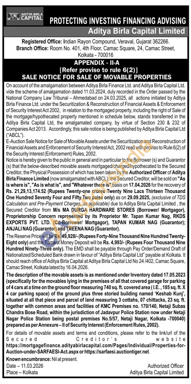 The description of the movable assets is as mentioned under Inventory dated 17.05.2023 (specifically for the movables lying in the premises of all that covered garage for parking of 4 cars at a time on the ground floor measuring 740 sq. ft. covered area (I.E., 185 sq. ft. X 4 car parking space) of the ground plus three storied building named 'Keshab Kunj', situated at all that piece and parcel of land measuring 3 cottahs, 07 chittacks, 23 sq. ft. together with common areas and facilities of KMC Premises no. 170/140, Netaji Subas Chandra Bose Road, within the jurisdiction of Jadavpur Police Station now under Netaji Nagar Police Station being postal premises No.5/57, Netaji Nagar, Kolkata -700040) prepared as per Annexure-II of Security Interest (Enforcement Rules, 2002).