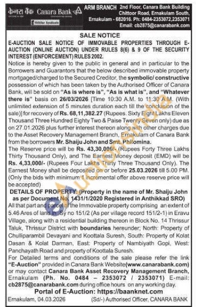 All that part and parcel of the Immovable property comprising an extent of 5.46 Ares of land in Sy no 151/2 (As per village record 151/2-1) in Eravu Village, along with a residential building thereon in Block No. 14 Thrissur Taluk, Thrissur District with boundaries hereunder, North: Property of Chulliparambil Devayani and Koottala Suresh, South: Property of Kolat Dasan & Kolat Darman, East: Property of Nambiyath Gopi, West: Panchayath Road and property of Koottala Suresh.