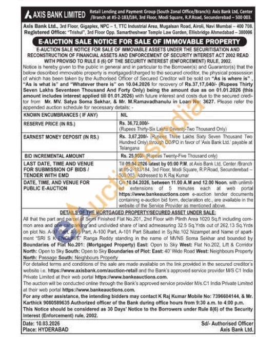 All that the part and parcel of Semi Finished Flat No.201, 2nd Floor with Plinth Area 1020 Sq.ft including com mon area and one car parking and undivided share of land admeasuring 32.5 Sq. Yrds out of 262.13 Sq. Yrds on plot No. A-97 Part, A-98 Part, A-100 Part, A-101 Part Situated in Sy.No. 102 Nizampet and Name of apart-ment "SRISK ENCLAVE Ranga Reddy standing in the name of MVNS Soma Sekhar and bounded by Boundaries of Flat No.201: (Mortgaged Property) East: Open to Sky West: Flat No.202, Lift & Corridor North: Open to Sky South: Open to Sky Boundaries of Plot: East: 40 Wide Road West: Neighbours Property North: Passage South: Neighbours Property