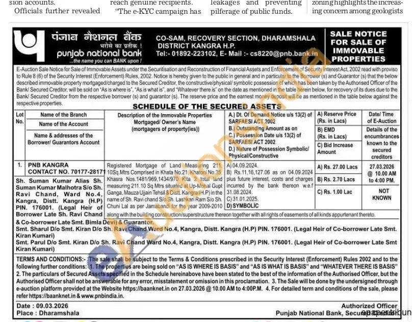 Registered Mortgage of Land Measuring 211. 10Sq. Mtrs Comprised in Khata No.21, Khatoni No 35, Khasra Nos. 1481/969,1434/970 Kita 2 total land measuring 211.10 Sq Mtrs situated at Up-Mohal Gupt Ganga, Mauza Ujjain Tehsil & Distt. Kangra (H.P) in the name of Sh. Ravi chand Sio Sh. Lashkari Ram Sio Sh. Chuni Lal as per Jamabandi for the year 2009-2010along with the building construction/superstructure thereon together with all rights of easements of all kinds appurtenant thereto